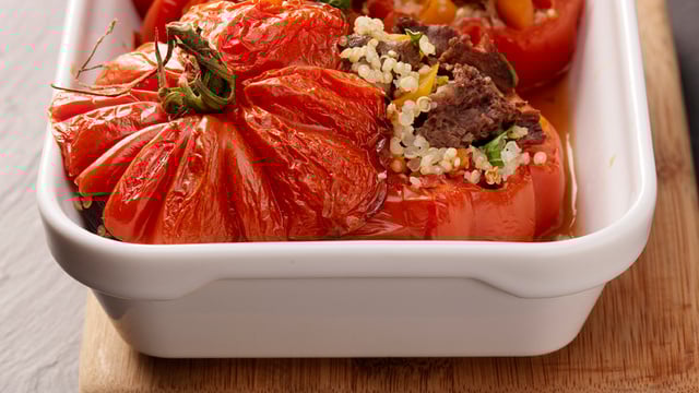 Remplir généreusement les tomates avec cette farce et les disposer dans un plat à four. Déposer les chapeaux des tomates sur le dessus, arroser d'un filet d'huile d'olive et enfourner pour 30 minutes de cuisson.