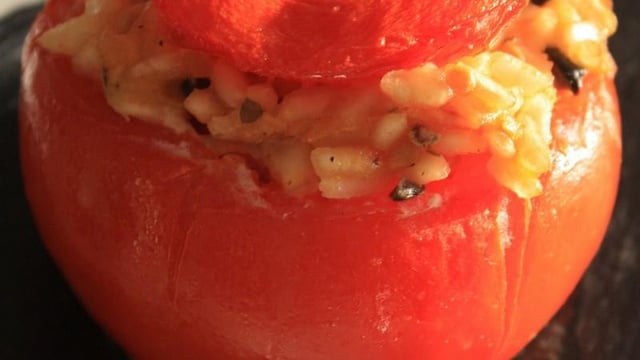 Remplir vos tomates, placez-les dans un plat à gratin et arrosez-les du reste de bouillon et d'un peu d'huile d'olive.