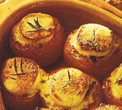 A la sortie du four, garnissez chaque tomate avec une grosse tranche de fromage saint marcellin.