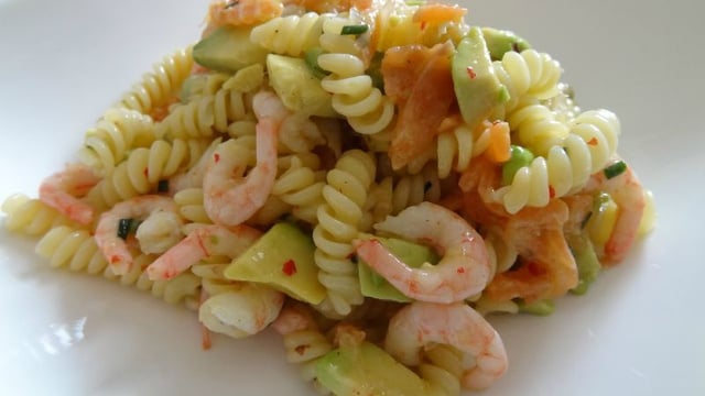 Une petite salade de pâtes au saumon et crevettes, bien fraîche avec des notes d'agrumes et de l'avocat. Délicieux !