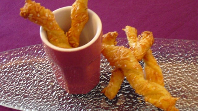 Commencez par étalez votre pâte feuilletée et à l'aide d'un pinceau de cuisine appliquez le jaune d'oeuf préalablement battu sur toute la surface de la pâte, saupoudrez de gruyère et de sésame puis passez le rouleau pour imprégniez les ingrédients dans la pâte.