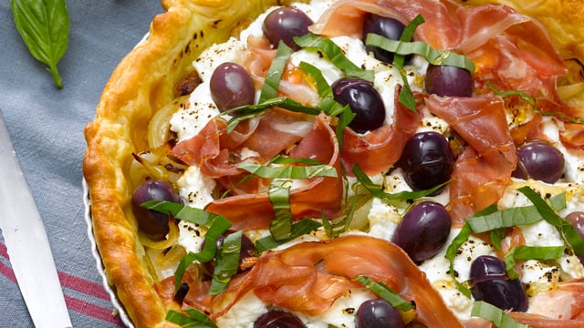 Sortir la tarte et disposer dessus le jambon, le basilic grossièrement haché et arroser l'ensemble de miel à l'aide d'une fourchette.