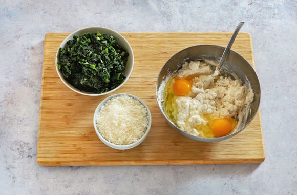 Ajoutez le Grana Padano AOP râpé pour la farce.. Mélangez le tout. Ajoutez les épinards, après les avoir bien pressés dans vos mains pour les égoutter, mélangez de nouveau.