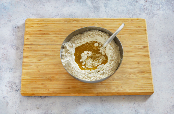 Dans un grand saladier, mélangez la farine avec le sel fin. Creusez un puit au centre, ajoutez l'huile d'olive et l'eau. A l'aide d'une fourchette, incorporez la farine au centre, en partant de l'extérieur vers l'intérieur.