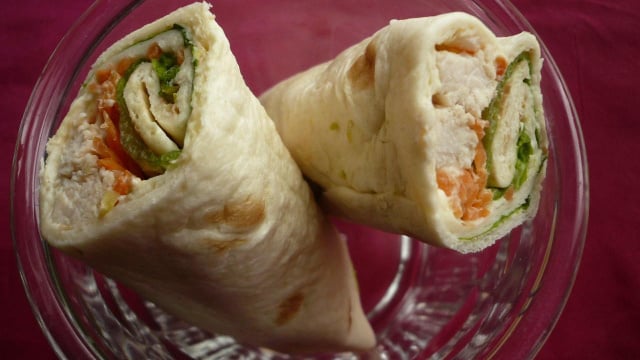 Étaler les tortillas sur une grande assiette et les garnir en répartissant sur la surface, une c à c de sauce aux cornichons, une poignée de carottes râpées, deux lanières de poulet et une grande feuille de salade. Rouler aussi serré que possible et maintenir au frais dans une boîte hermétique ou sous un film alimentaire. Ces tortillas qui peuvent se conserver une journée au réfrigérateur.