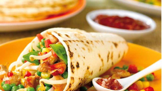 Des tortillas de blé garnies de tendres dés de poulet, des pois croquants, du maïs, du soja et des poivrons, relevées par une sauce au ketchup et Tabasco qui charmeront petits et grands !
