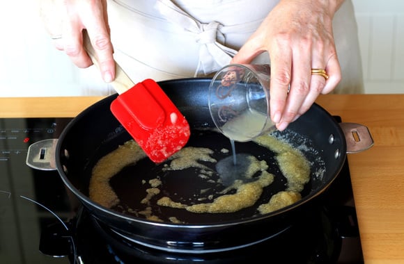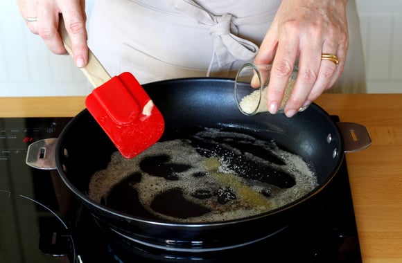 2Faites fondre le beurre dans une poêle. Quand il est bien mousseux, ajoutez le sucre et mélangez.