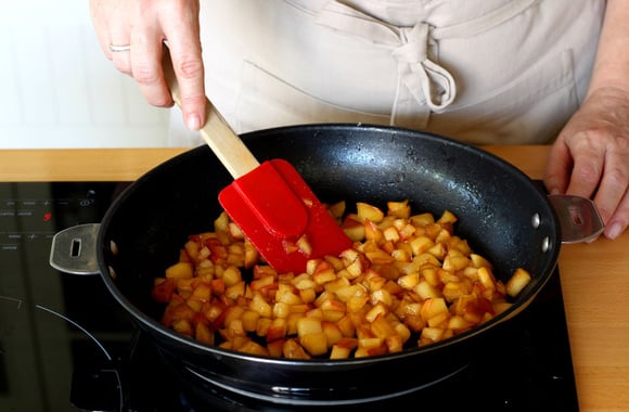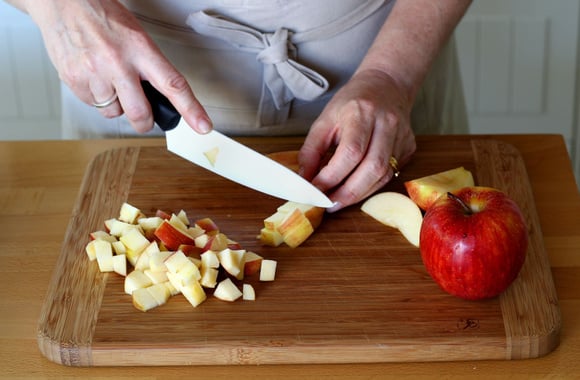 1Coupez les pommes en 4, retirez le coeur puis coupez la chair en dés, sans peler les pommes.