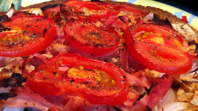 Couper le jambon en fines lamelles, l'oignon en tranches fines, le chèvre en cubes et la tomate en rondelles, et les placer successivement sur la pizza (en terminant par les tomates).