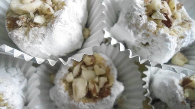Recouvrez la plaque avec 5g de sucre glace et disposez les touagins. Mettre au four,à 130°C, pendant 35mn. Laissez refroidir et décorez-les en roulant dans le sucre glace les touagins. Ajoutez dessus, une pointe de pistache ou d'amandes.