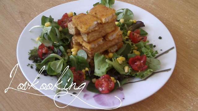 Pendant la fin de cuisson des frites et du poisson pané, dressez l'assiette : Répartissez le mesclun de salades autour de l'assiette. Coupez les tomates cerises en deux, puis disposez-les de façon régulière sur le mesclun. Parsemez par dessus des grains de maïs doux. Assaisonnez en répartissant l'estragon finement haché.