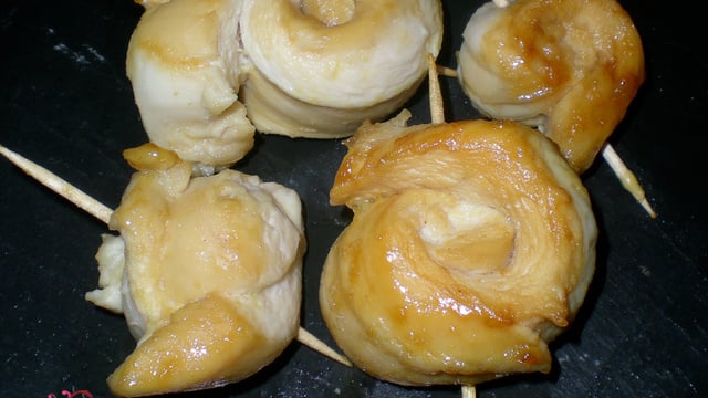 Découpez les escalopes en lamelles dans le sens de la longueur, roulez les sur elles mêmes et piquez un cure dent pour les maintenir