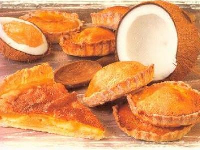 Foncer un moule à tarte avec la pâte brisée puis la piquer avec une fourchette, étaler ensuite la confiture de coco, la crème pâtissière et la pâte obtenue en mélangeant la farine avec les oeufs, le sucre, le zeste de citron et l'extrait de vanille.