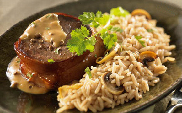 Dans les assiettes, déposez les tournedos, ajoutez la sauce et répartissez le riz. Ajoutez quelques feuilles de coriandre.