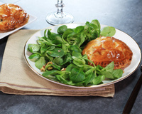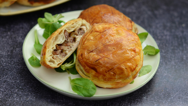 Façonnez des formes à l’aide des chutes et déposez-les sur les tourtes. Entaillez la pâte au centre à l’aide de la pointe d’un couteau puis enfournez pour une vingtaine de minutes. Servez avec une salade de mâche assaisonnée et des cerneaux de noix.
