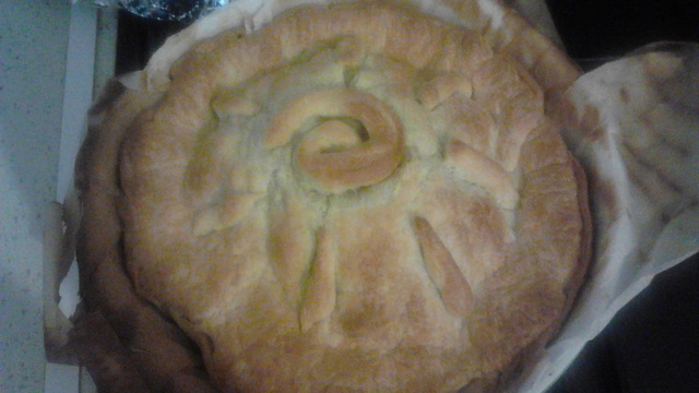 Astuce déco : Garder un peu de pâte pour pouvoir décorer le dessus de la tourte en formant un soleil (une spirale au milieu et des boudins de pâte pour faire les rayons du soleil) voir la photo !
