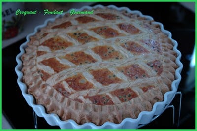 Etaler, la pâte réservée, couper des bandelettes, les poser en croisillons sur la farce. Retourner les bords de pâte et souder le tout en appuyant avec les doigts.