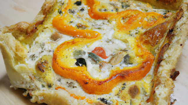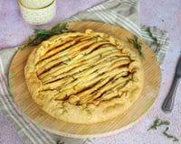 Sur une pate feuilleté et dans un plat à tarte individuel, déposez des lamelles de poivrons marinés à l'huile d'olive et aromates, placez le crottin au milieu et recouvrir d'une deuxième pate sablé.
