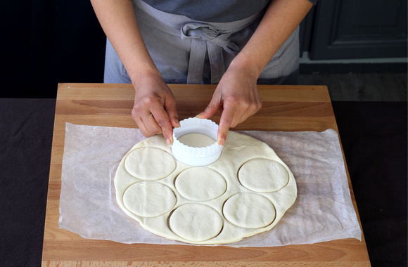 3Étalez la première pâte à pizza puis coupez des petits cercles à l'aide d'un emporte-pièce de 6 cm de diamètre.