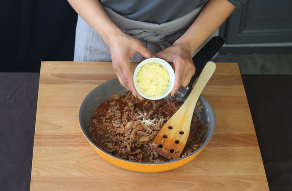 2Laissez complètement refroidir puis ajoutez le fromage râpé. Mélangez et réservez.