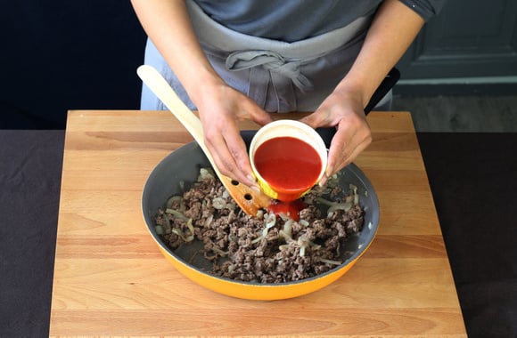 1Dans une poêle, faites revenir l'ail et l'oignon dans l'huile d'olive. Ajoutez progressivement la viande hachée en l'écrasant avec une fourchette. Salez et poivrez. Ajoutez ensuite le coulis de tomate. Laissez mijoter à feu doux jusqu'à obtenir une sauce très épaisse.