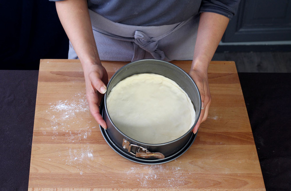 4Étalez la deuxième pâte à pizza au fond d'un moule à tarte en coupant les bords.