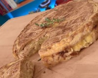 Découpez un autre rond de pâte légèrement plus grand que le moule. Déposez le sur la tarte et rabattez les bords vers l'intérieur et badigeonnez de nouveau d'œuf.