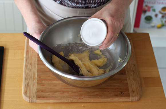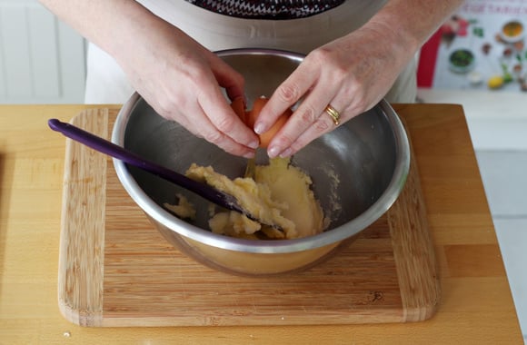 2Ajoutez l’œuf et mélangez, jusqu'à obtenir un mélange crémeux.