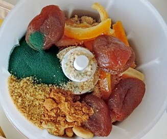 1Placer les dattes, noix de cajou, amandes, oranges confites, abricots, linette, spiruline et guarana blanc dans le bol du mixer et mixer le tout.