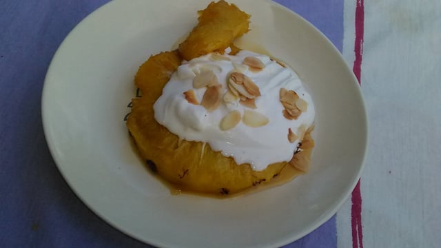 Ce sont des tranches d'ananas cuites dans un caramel. Puis elles sont servies tièdes avec une crème chantilly vanillée au mascarpone et des amandes grillées.