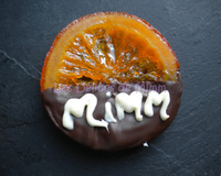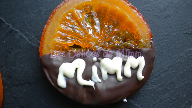 J'ai reçu une boîte de chocolats (de pralines comme on dit chez nous) d'une marque bien connue et sur le dessus, j'ai découvert une nouveauté : une tranche d'orange confite dont la moitié était recouverte de chocolat. C'était délicieux et j'ai eu l'idée de réaliser cette recette.
