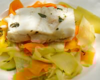 Détaillez 4 portions de cabillaud, assaisonnez les filets puis enroulez-les partiellement de feuille de nori. Humidifiez les galettes de riz avant de recouvrir les filets de cabillaud. Cuire les filets de cabillaud à la vapeur.