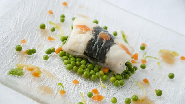 Filet de cabillaud de Norvège recouvert partiellement d'algue Nori, puis enrobé d'une feuille de galette de riz.