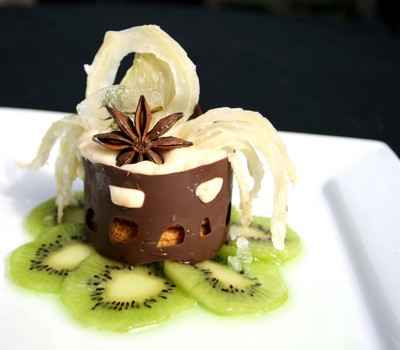 Dresser en posant sur les kiwis les sablés, entourer d'un grillage, poser la ganache à la poche à douille, garnir avec un anis étoilé, un fenouil cristallisé...