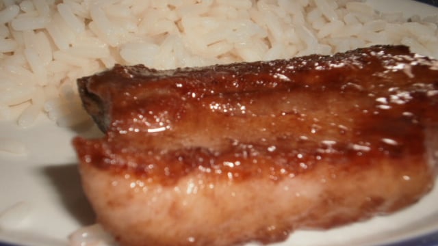Faire chauffer l'ail écrasé, le piment, le gingembre et le sucre dans les sucs de cuissons de la viande, puis ajouter le vin. Laisser épaissir, remettre les travers et les enrober de sauce.