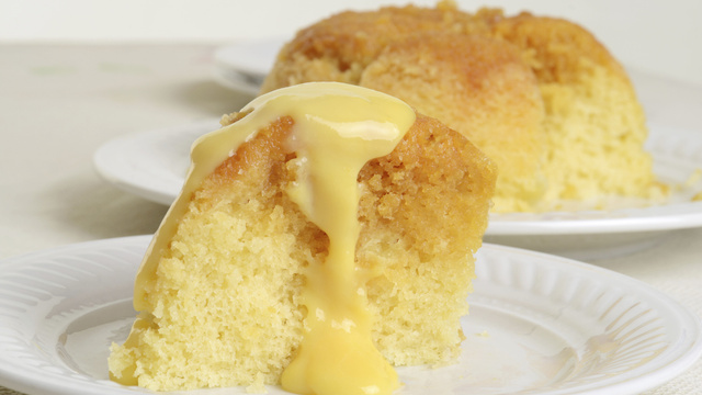 Laissez reposer le gâteau 10 minutes avant de le démouler sur un plat de service. Ajoutez de la mélasse ou du miel si vous le souhaitez et servez avec la custard. Vous pouvez aussi proposer des fruits rouges avec.