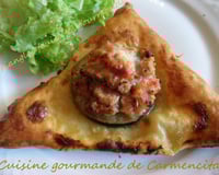 Dérouler la pâte feuilletée et la couper en 6 parts, recouper le bout arrondi pour obtenir de grands triangles. Les poser sur la plaque du four recouverte de papier sulfurisé et les badigeonner du jaune d'oeuf délayé dans un peu d'eau.
