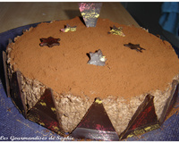 Préparer la décoration, saupoudrer le gâteau avec du cacao en poudre à l'aide d'une passoire. Faire un caramel avec 50g de sucre et 5 cl d'eau