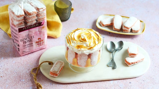 Un trifle avec du Biscuit Rose de Reims Fossier, du lemon curd maison et une meringue, le tout présenté dans une grande coupe à dessert pour plus de convivialité et de gourmandise.