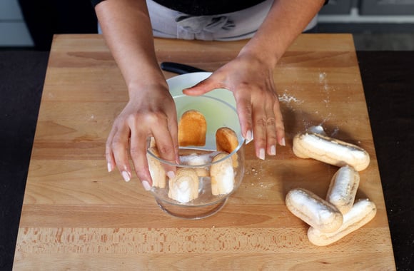 Trempez légèrement les biscuits à la cuillère dans le limoncello.