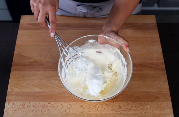 Ajoutez les blancs en neige à la préparation. Placez dans une poche à douille et conservez au frais.