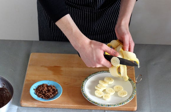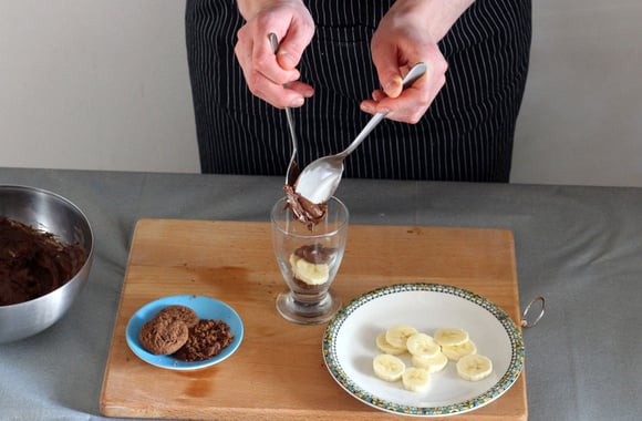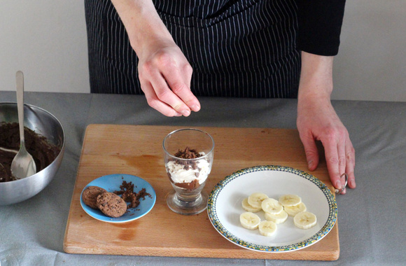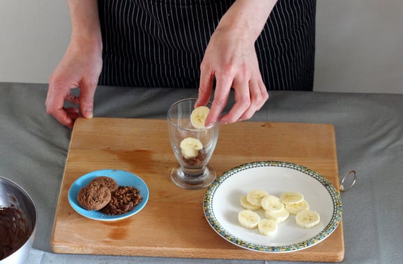 Déposez au fond de chaque verrine, un peu de biscuit émietté, des rondelles de banane.