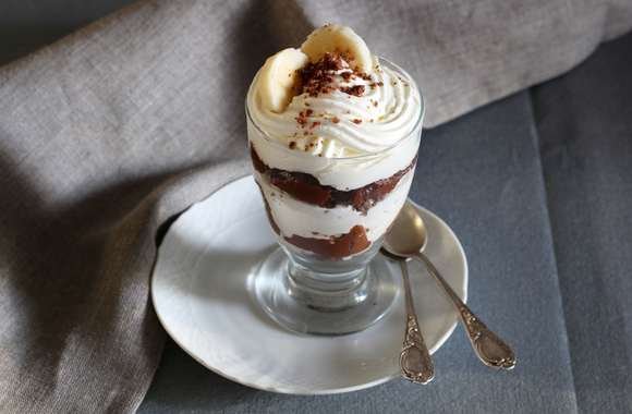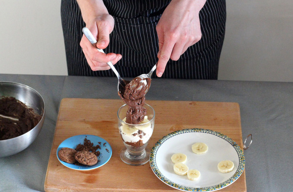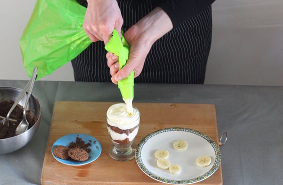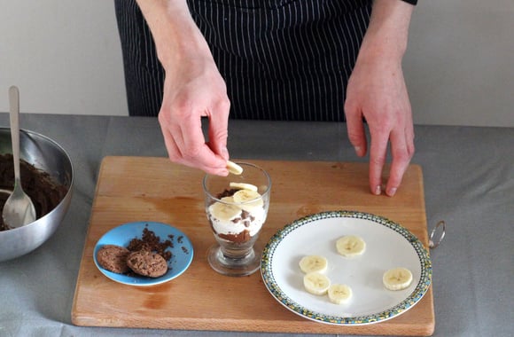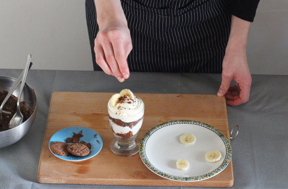 Juste avant de servir, décorez le dessus de chaque verrine avec des biscuits émiettés et quelques rondelles de banane.