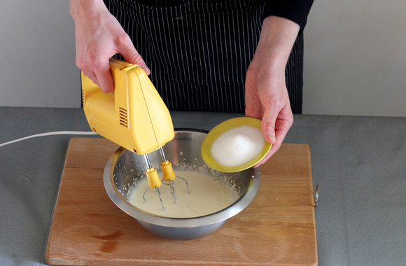 1Versez la crème liquide dans un saladier et ajoutez le sucre tout en mélangeant au batteur ou au fouet.