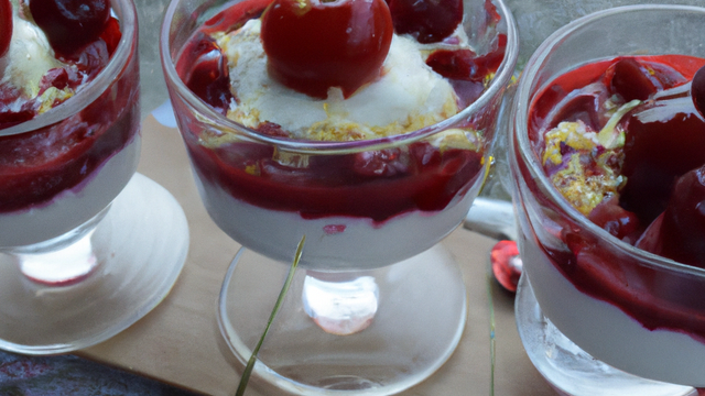 Verrines composées d'une compotée de cerises, de brioche imbibée et d'une crème express vanillée.