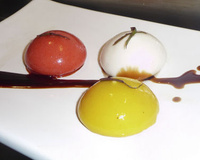 Un pré-dessert, en déclinaison, proposant une 'crème' à la Tomate Rouge prise dans une gelée Mangue/Poivron, à la Tomate Jaune dans une gelée à la Fraise, à la Tomate Verte dans une gelée Chocolat Blanc/Parmesan ...