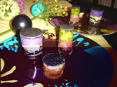 Verre orangeEcraser les jaunes d'oeufs cuits avec un peu de mascarpone, parfumer au curcuma et au curry, saler. Faire mariner le saumon coupé en lamelles dans un peu d'huile d'olive salée avec les graines et la pulpe des fruits de la passion.