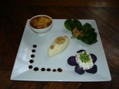 4- éplucher vitelottes et couper en rondelles, disposer dans l'assiette. Installer au centre de grosses noix de crème à la ricotta. Déposer dessus les tomates confites et la feuille de basilic. Laisser glisser un filet d'huile d'olive sur le tout. Egouter les bleues d'auvergne et écraser les encore brûlantesavec de belles noisettes de gorgonzola, sel et poivre. Au moment de servir faire une quenelle de cette écrasée, décorée d'un cerneau de noix.