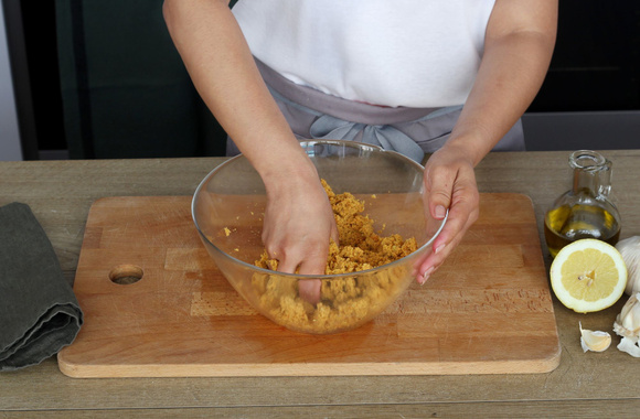 Mettez la préparation des falafels Jean Martin dans un saladier et malaxez la pâte à la main.