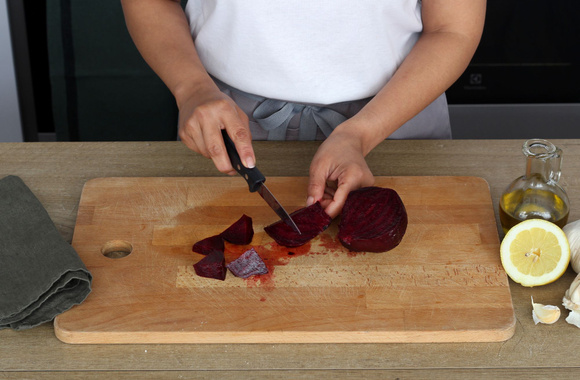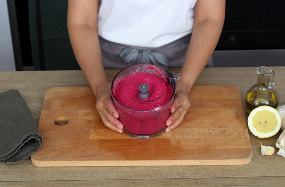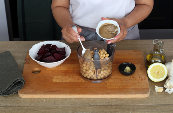 2Égouttez les pois chiche puis versez-les dans le bol d'un blender. Ajoutez les dés de betterave, l'ail, la crème de sésame (tahiné) et le jus de citron.